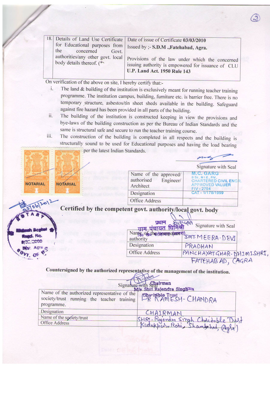 I _Er. M . C. Grag hereby certify that the institution namely Shri Rajendra Singh Degree College, Dhimishri,Agra situated at Khasra No.1374/1, Dhimishri, Tehasil-Fatehabad, Agra have personally inspected the land and building mentioned in the statement below and the same is based on the registered documents, data measurements and specifications found in the site.